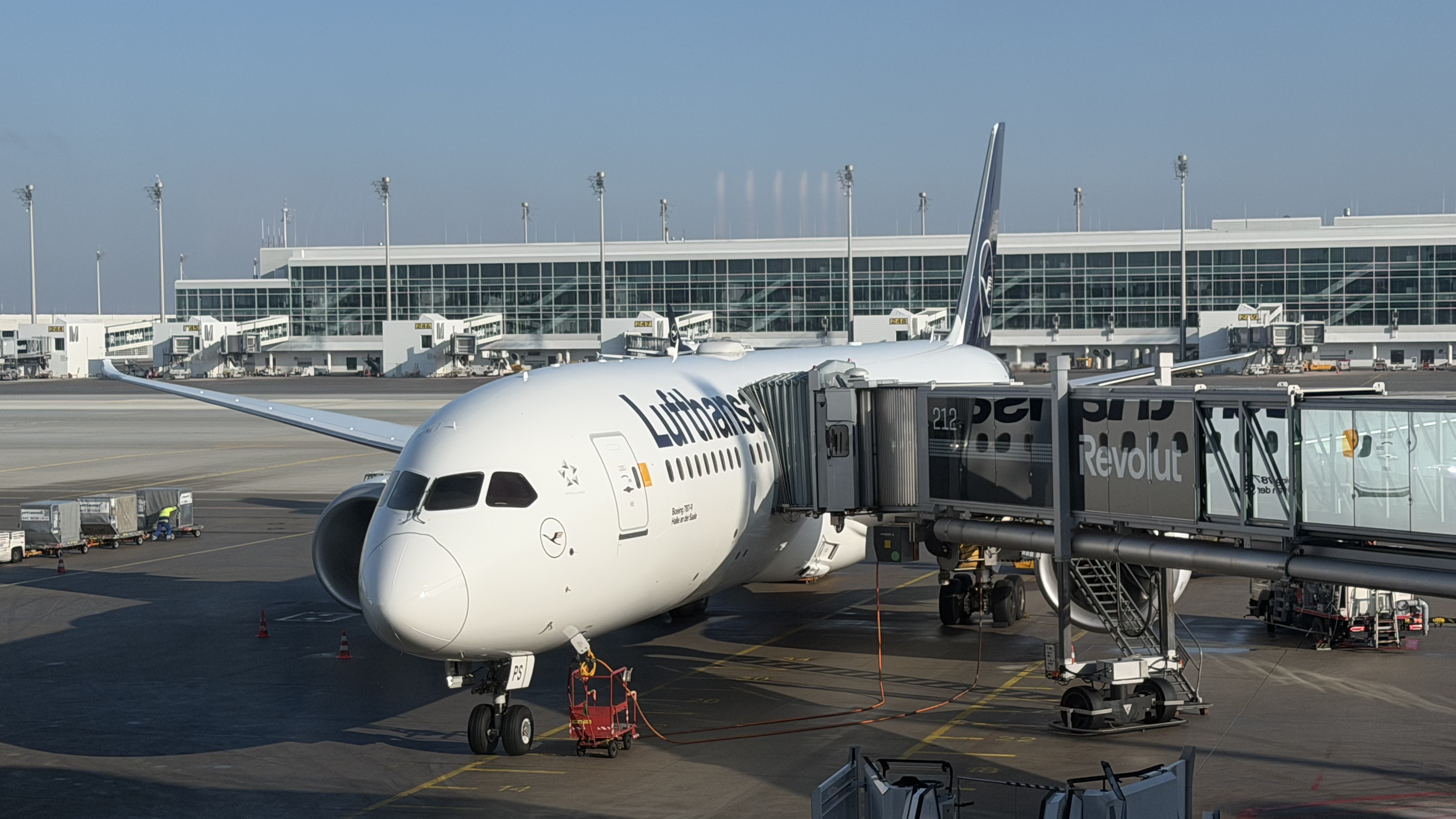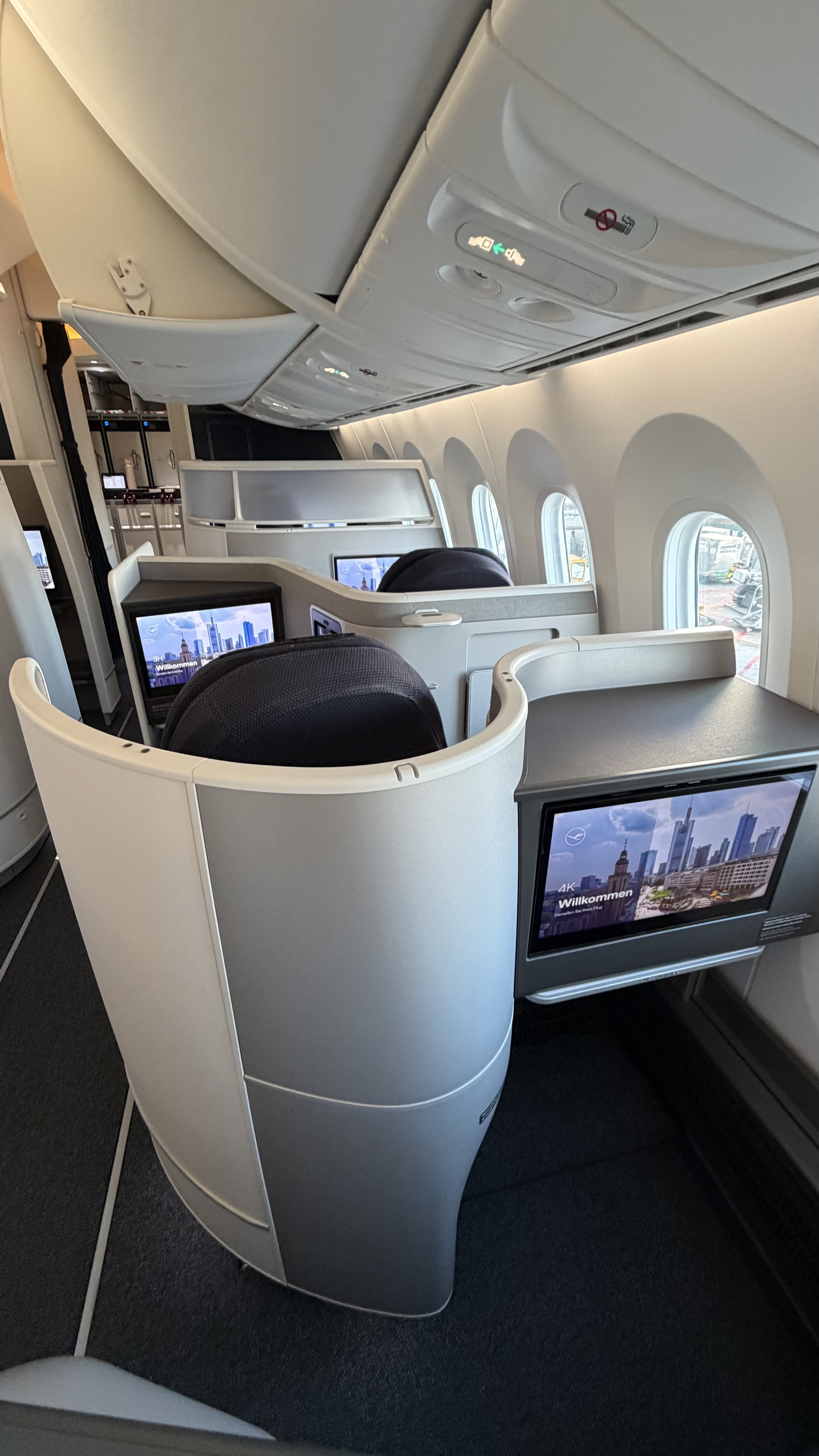 At 2:00pm, LH 109 departs from MUC to Frankfurt (FRA). What makes this flight particularly interesting is the aircraft assignment: a 787-9 (D-ABPS). The plane has just arrived from Mumbai and will be shuttling back and forth between Munich and Frankfurt a few times today before heading on to Rio (GIG) in the evening. As far as I know, this is one of the aircraft already fitted with Lufthansa’s new Allegris cabin—so naturally, I’m curious.