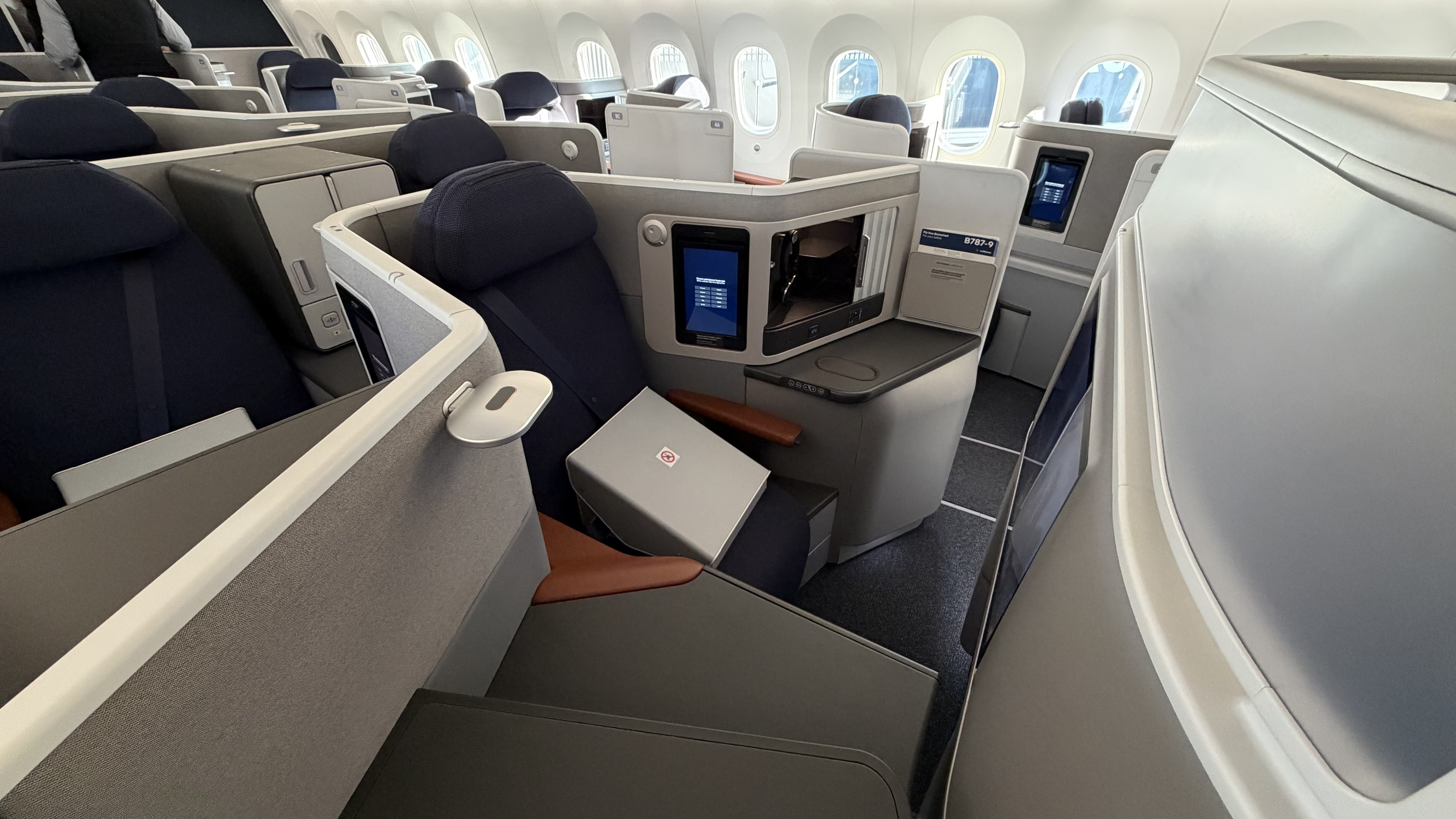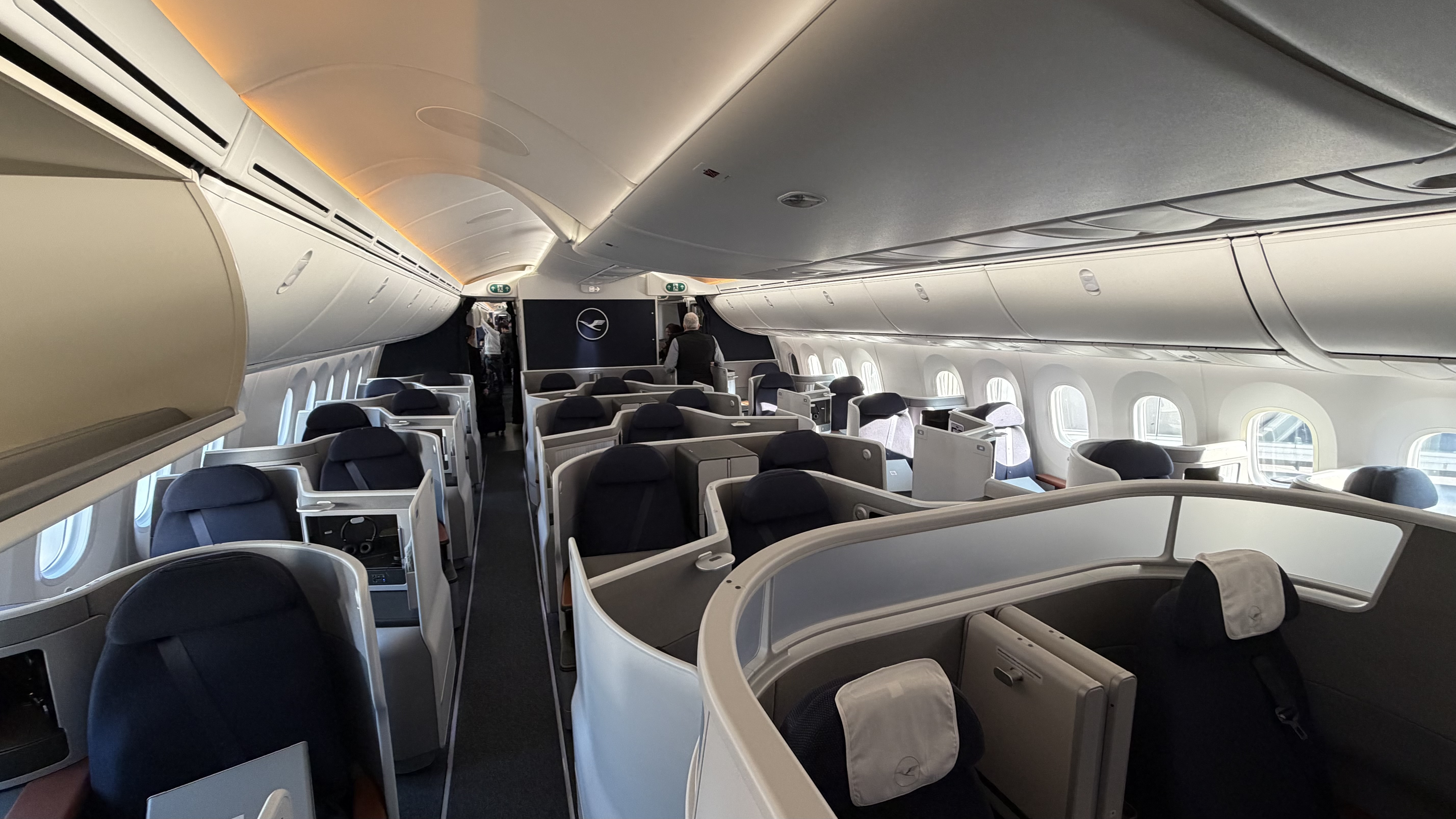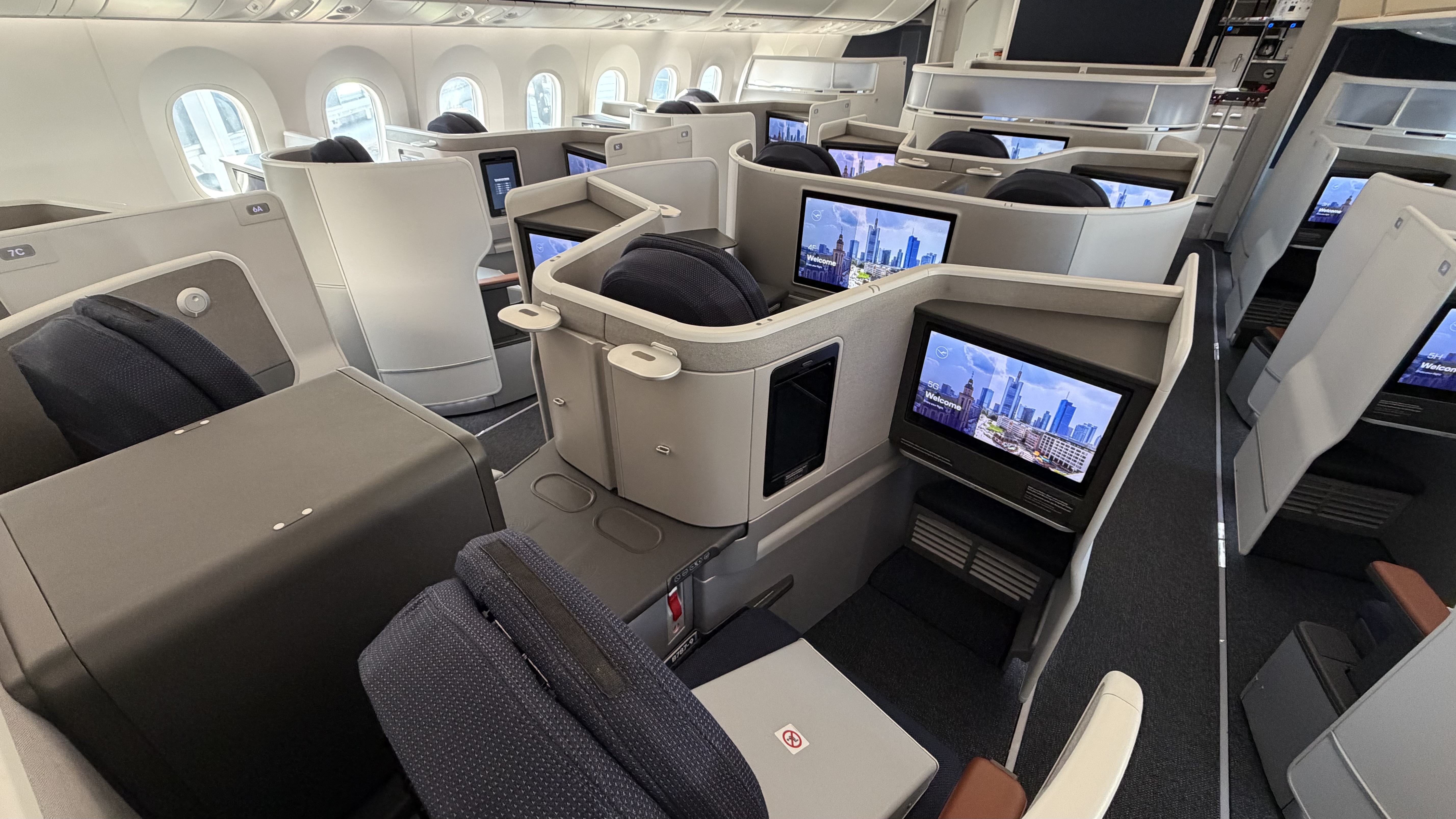 As expected, the aircraft features the new Allegris cabin. However, since the Business Class cabin—apart from the four front suite seats—has not yet been approved by the FAA, all Business Class passengers are seated in Premium Economy.